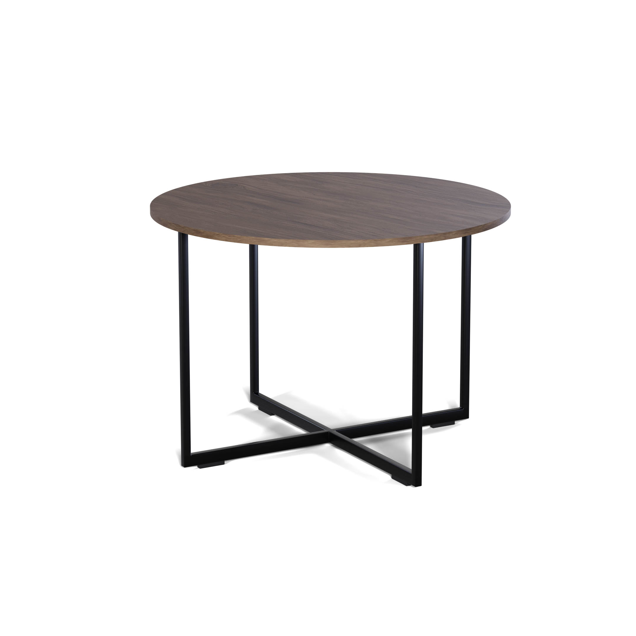 Het tafelblad is gemaakt van natuurlijk eikenhout, wat het zowel duurzaamheid als een tijdloze uitstraling geeft. De subtiele nerven van het hout en de warme, vriendelijke textuur maken het ideaal voor interieurs die variëren van modern tot meer klassiek. De metalen basis voegt stabiliteit en een industrieel accent toe aan de tafel, wat een interessant contrast met het natuurlijke hout creëert.